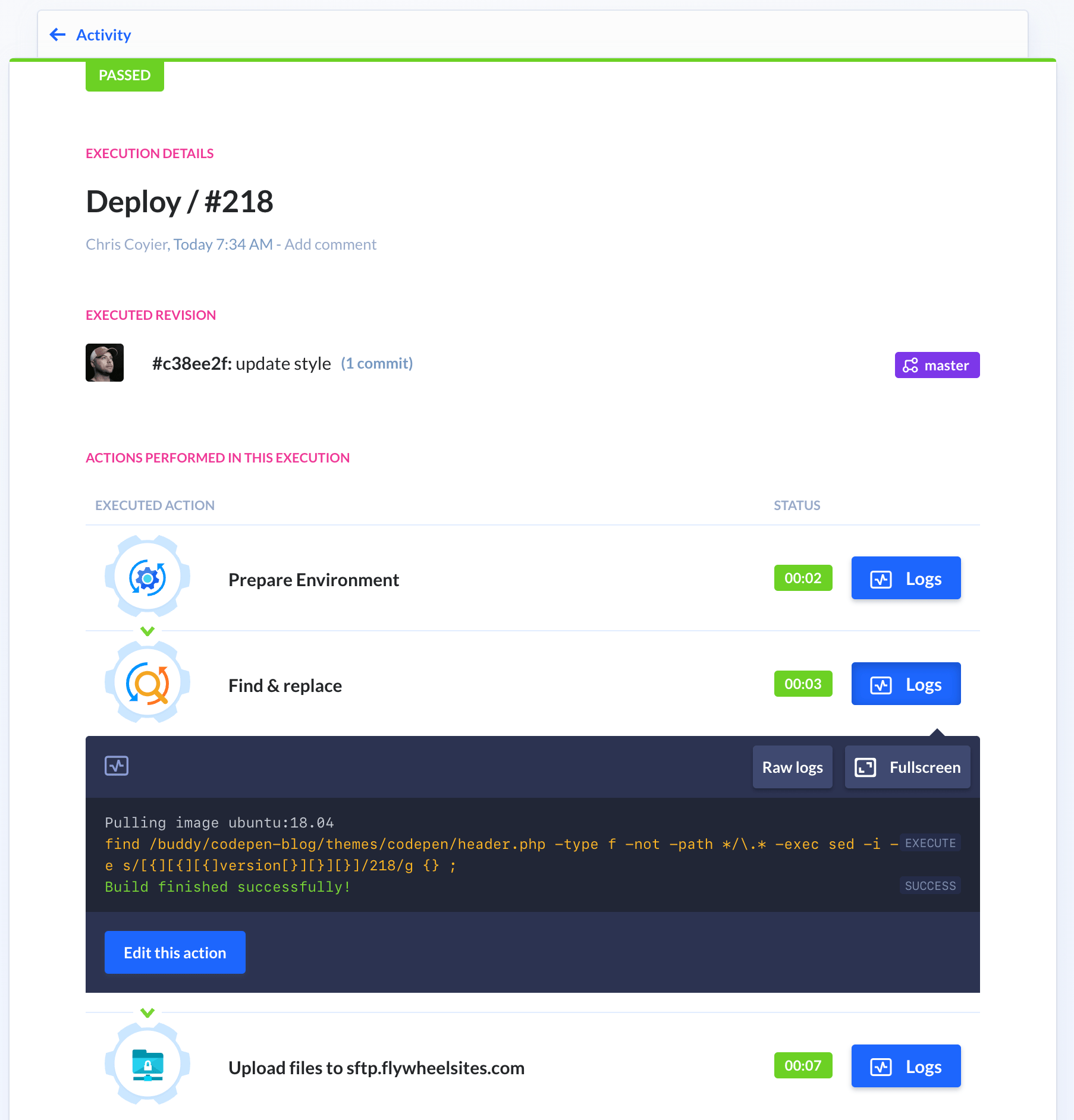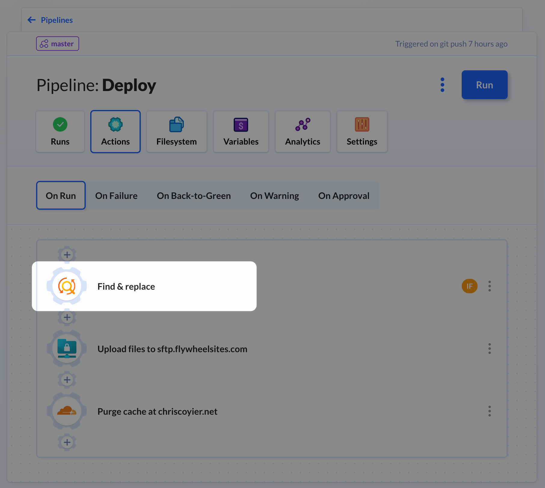 Now here’s an example Buddy pipeline. A lot of times, I’ll have one action: just deploy the dang site. But here we’ll add a Find & Replace setup first.