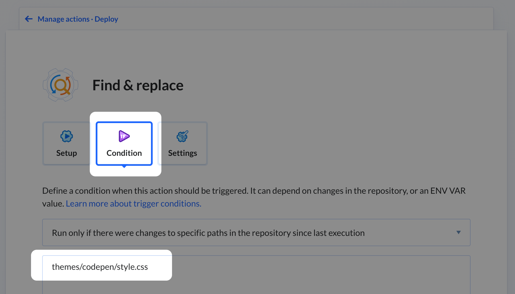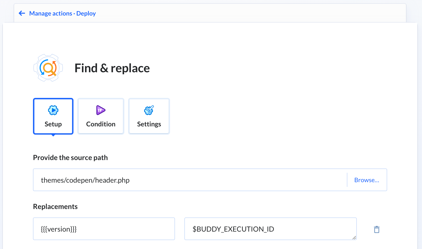 Within the settings for Find & Replace, we get to tell it what file to run it on, what to look for, and what to replace it with. Miraculously, there are magical variables you have access to (like your ENV vars) including one called $BUDDY_EXECUTION_ID which is a unique ID per deployment, so it’ll work great for cache busting.