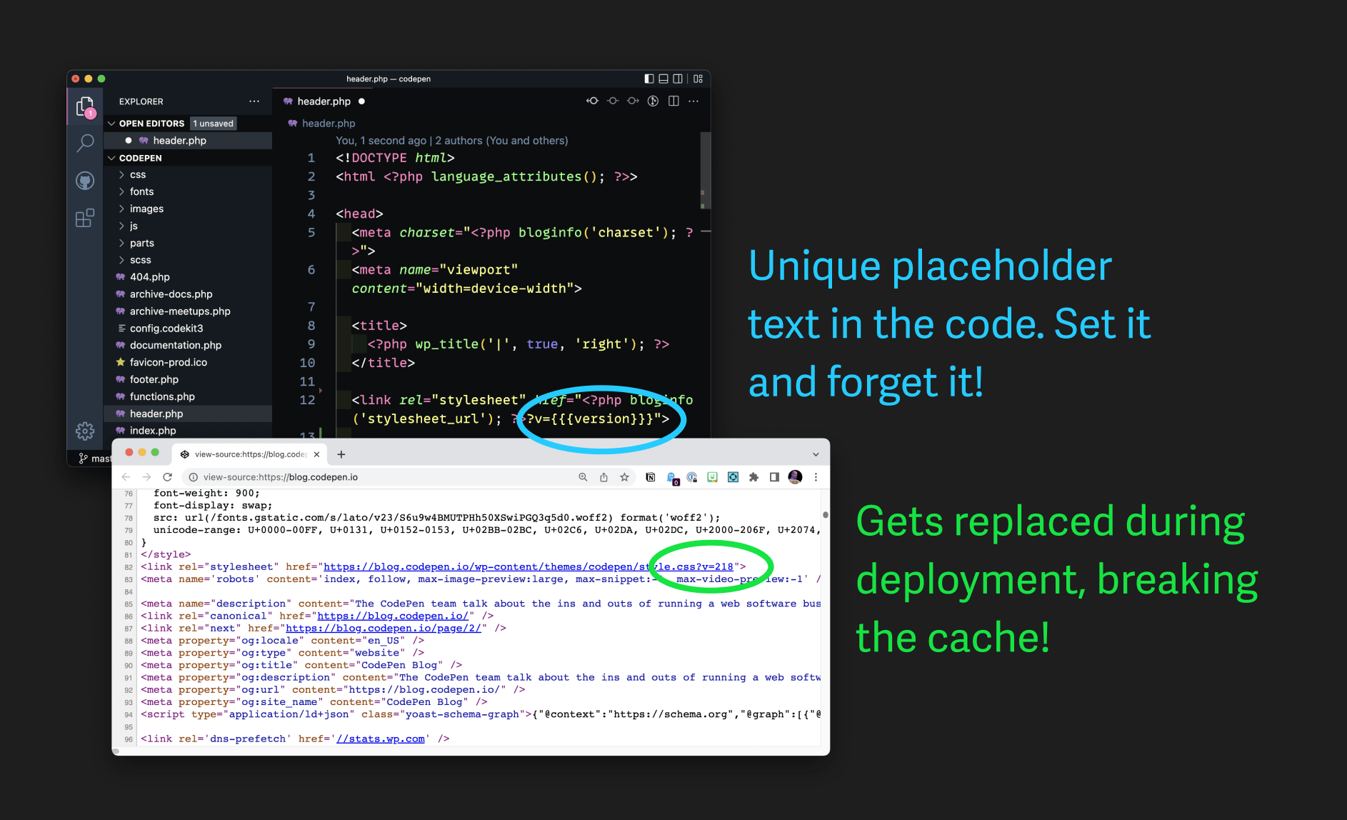 cache-control: public, max-age=31536000Code language: PHP (php)So when I need to change that file, I need to break that cache, otherwise, users’ browsers that have already been to the site will hang onto their old version of file. That’s worse than a failed deployment, it’s almost like a half/broken deployment because it’s likely HTML has also changed that no longer correctly corresponds to the updated CSS. That’s bad.
